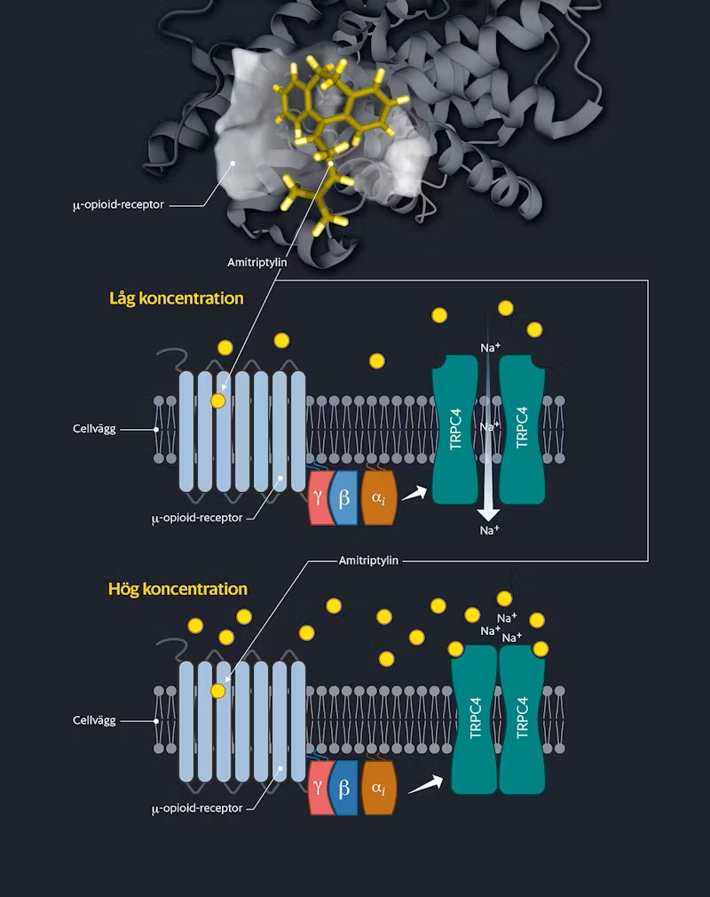 Så funkar det / Amitriptylin: Så lindrar det antidepressiva läkemedlet smärta Genom att binda till en opioidreceptor kan amitriptylin lindra smärta. Det kan förklara hur gamla tricykliska antidepressiva läkemedel, i låga doser, kan lindra smärta vid IBS.